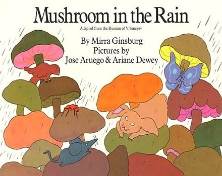 Mushroom in the Rain by Mirra Ginsburg, José Aruego, and Ariane Dewey. How many animals can fit under one mushroom cap during a rainstorm? Young readers will love to see who shows up to seek shelter, and exactly what happens to mushrooms in the rain.